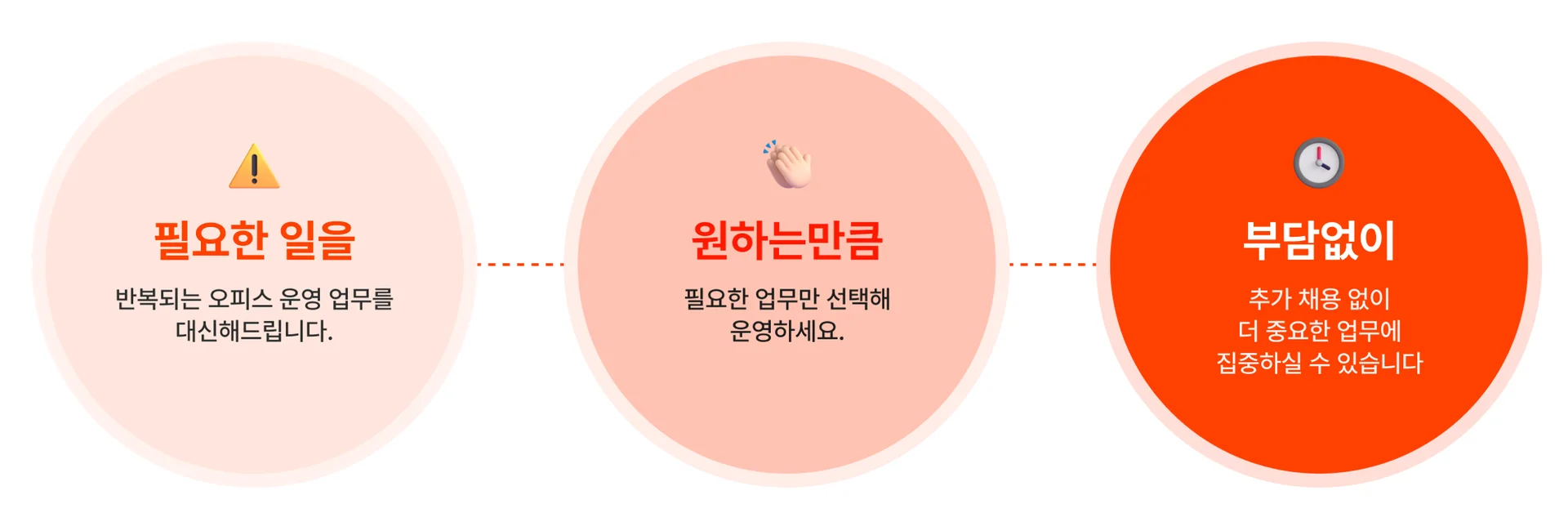 이런 포괄적인 총무 서포트 자체도 기존 시장에 없던 개념이라 참신하게 느끼시는 분들이 많은데요, 무엇보다 고객분들께 가장 신선하게 다가왔던 건 필요한 시간만큼만 유연하게 이용할 수 있다는 점이었던 것 같아요.