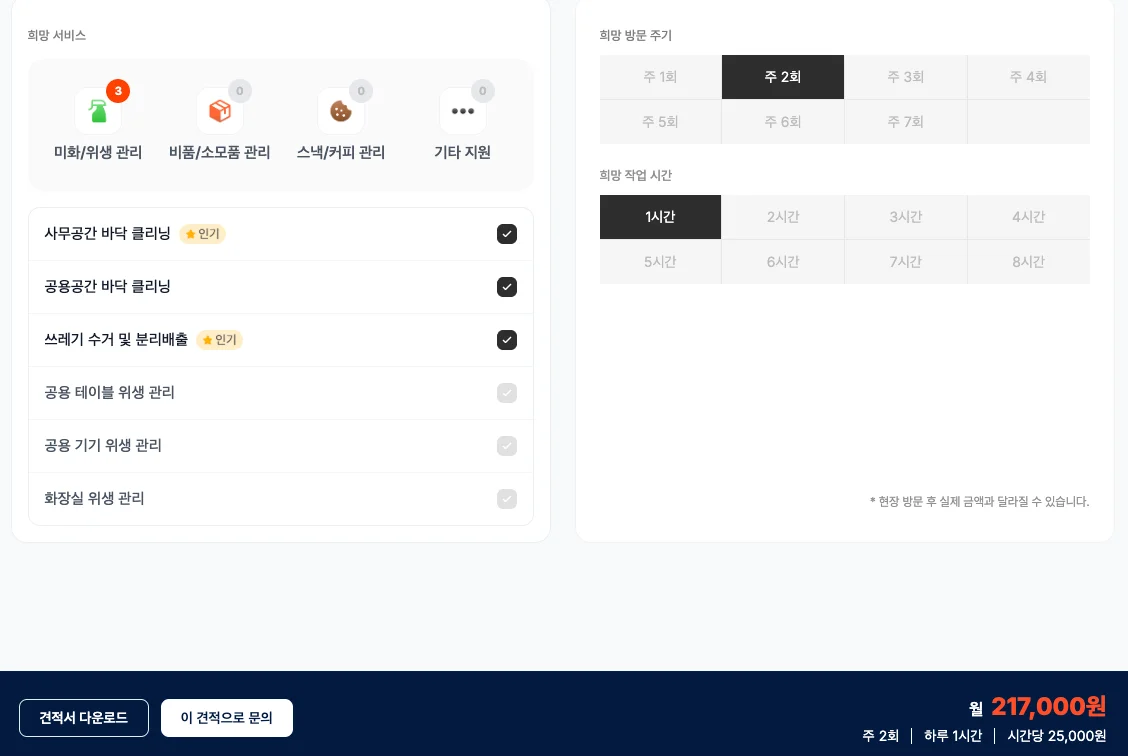 그래서 오피스버디가 도입한 두가지 제도는 ‘사전 견적’과 ‘실사 제도’ 입니다.아래 사진처럼 홈페이지를 통해 문의 전 가견적을 산출해보실 수 있도록 구현되어있어요.